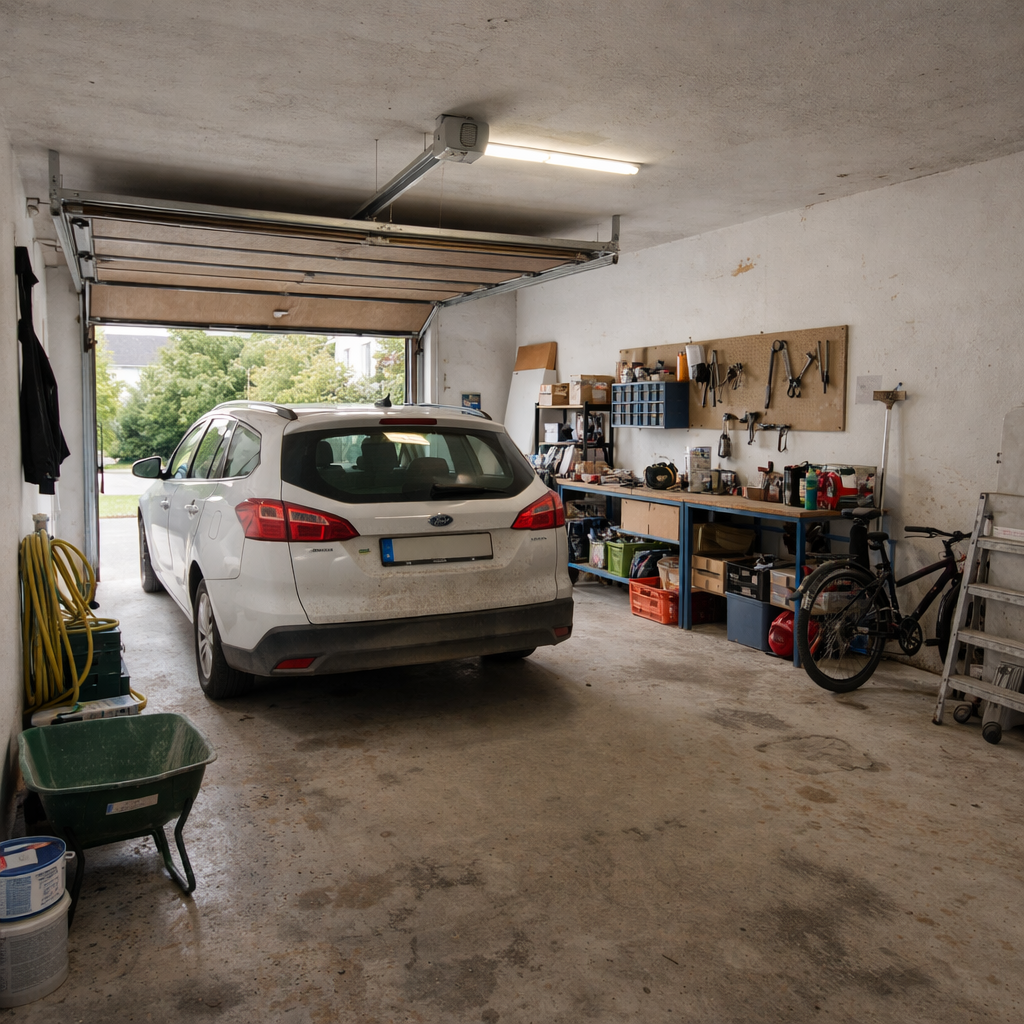 Die Immobilie verfügt über eine praktische Garage, die nicht nur Platz für ein Fahrzeug bietet, sondern auch zusätzlichen Stauraum für Werkzeuge, Fahrräder oder Gartengeräte.
